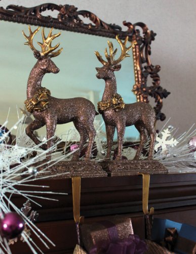 2 Nature's Glow Copper and Gold Glittered Reindeer Christmas Stocking Holders Feature