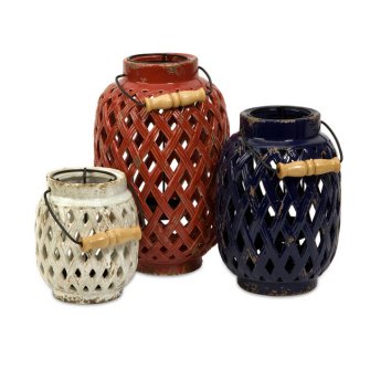 In small, medium and large, the set of three Bailey lanterns feature rich patriotic shades and a woven lattice pattern..Materials: 90% Ceramic, 10% Iron..Holds pillar candles..Removable candleholder makes lighting candles a cinch!.Item Dimensions: 5.75-6.5-7.5"h x 6.5-9.25-11.25"...