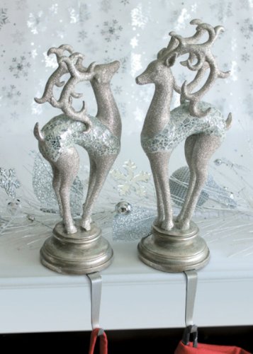 Set of 2 Silver Splendor Glitter Glass Mosaic Deer Christmas Stocking Holders Feature