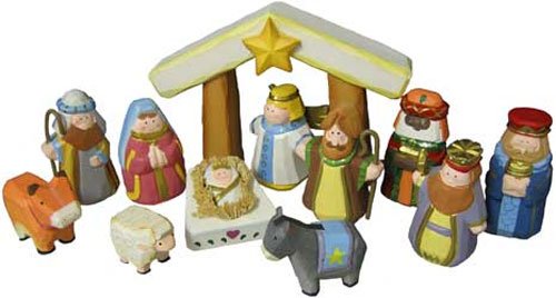 Nativity Set has 12 hand-carved pieces.Childrens First Nativity Set.All pieces in the Children's Nativity Set range in size from 1.5" to 5.5" tall.There are no small or breakable parts, making this set child friendly.Set pieces are painted with non-toxic lead free paints..
