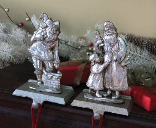 2 Santa Claus Classics Antique Silver Glittered Christmas Stocking Holders 8" Feature