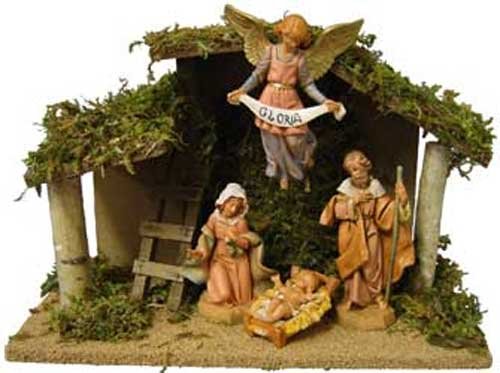 In the right corner, there is a ladder.Decorated with wood, bark and moss.Fontanini 3 Piece Holy Family Nativity Set with Stable.Measures 9.5 inches tall by 12 inches wide by 6 inches deep.Figures included are Mary, Joseph and Jesus..