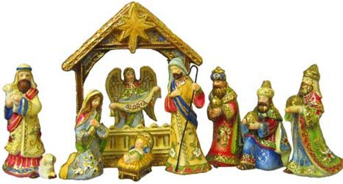 9 Piece Gold Accented Nativity Manger Set.Each of the figures measures 3-5", while the manger itself stands 7" tall.This set is made of cloisonné porcelain, which really accents the gold trim on each of the nativity figures.Includes the Jesus, Mary and Joseph, the Three Kings, a shepherd, and Gloria the angel.Figures made of a durable polymer to resist chips and breaks..