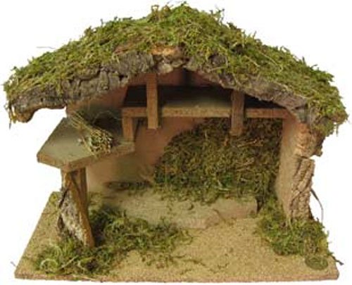 Fontanini Wooden Christmas Stable.Manger constructed of wood, bark and moss.Approximately 10 inches tall at the tallest center point, 14 inches across and 6.5 inches deep.This Fontanini Stable is a beautiful start for your nativity scene decorations.There are two, staggered, lofts across the back..