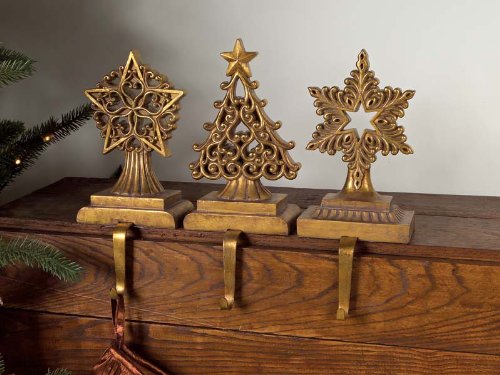 Set of 3 Antique Gold Stars and Christmas Tree Stocking Holders Feature
