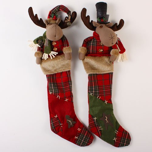 Set of 2 Modern Lodge Dimensional Patchwork Plaid Moose Christmas Stockings 28" Feature