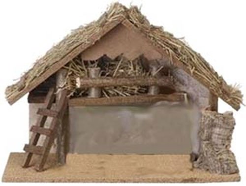 On the right hand side there is a decorative bark piece covering the side wall This Fontanini Stable is a beautiful start for your nativity scene decorations Approximately 9.5 inches tall, 12.5 inches wide and 6.5 inches deep Manger constructed of wood with a straw covered roof Small Italian Stable