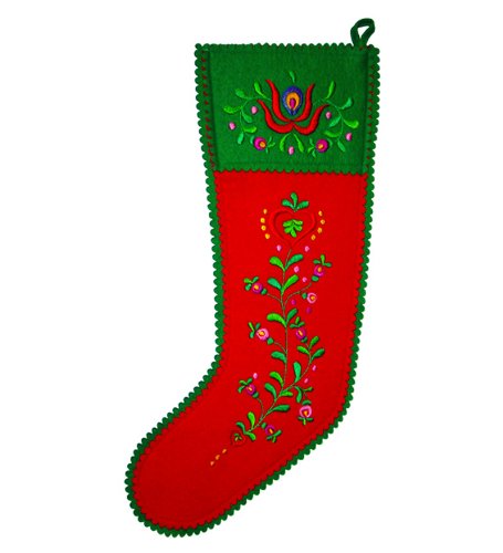 Includes a loop for easy hanging Green hand-chiseled scalloped edging Multi-colored embroidered accents Made of red and green felt